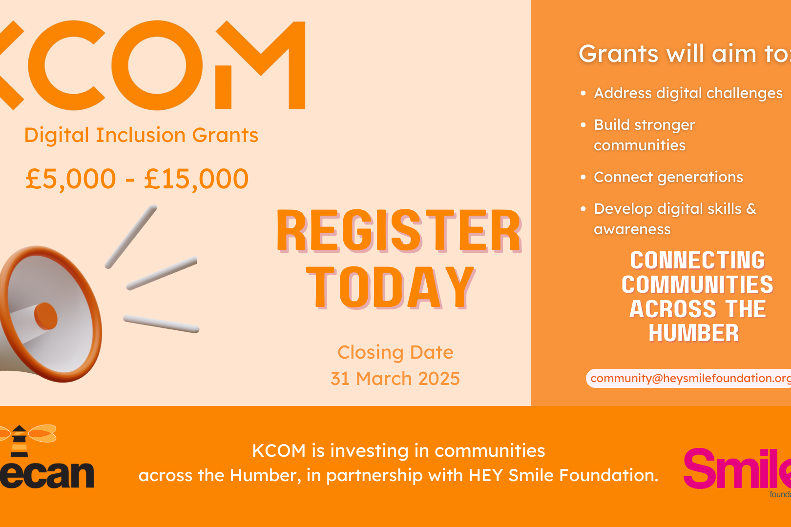 KCOM Funding to Boost Charities Online Welcome to the next round of funds, brought about by the game-changing partnership between KCOM and the HEY Smile...